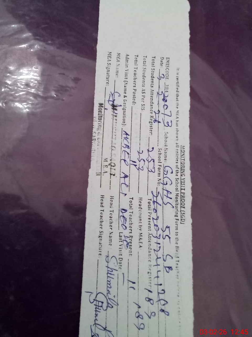 | Attendance Register | Head Teacher | MEA with School | Visit Proof |