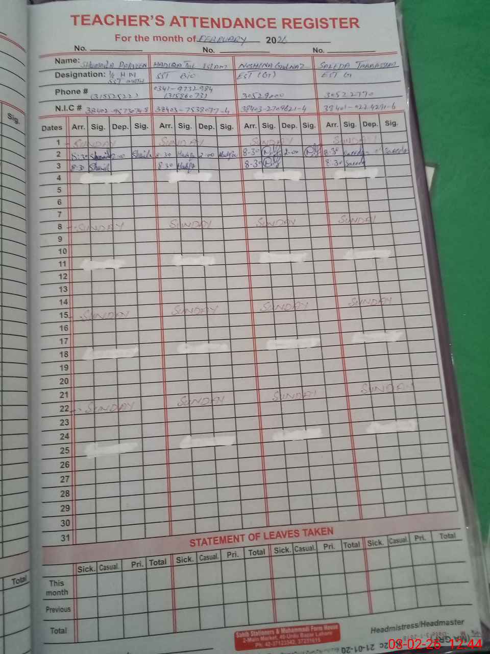 | Name: Sh**** Pr**** Designation: (School Headmaster's/Headmistress's) SST Phone/Cell Number: 03**** |