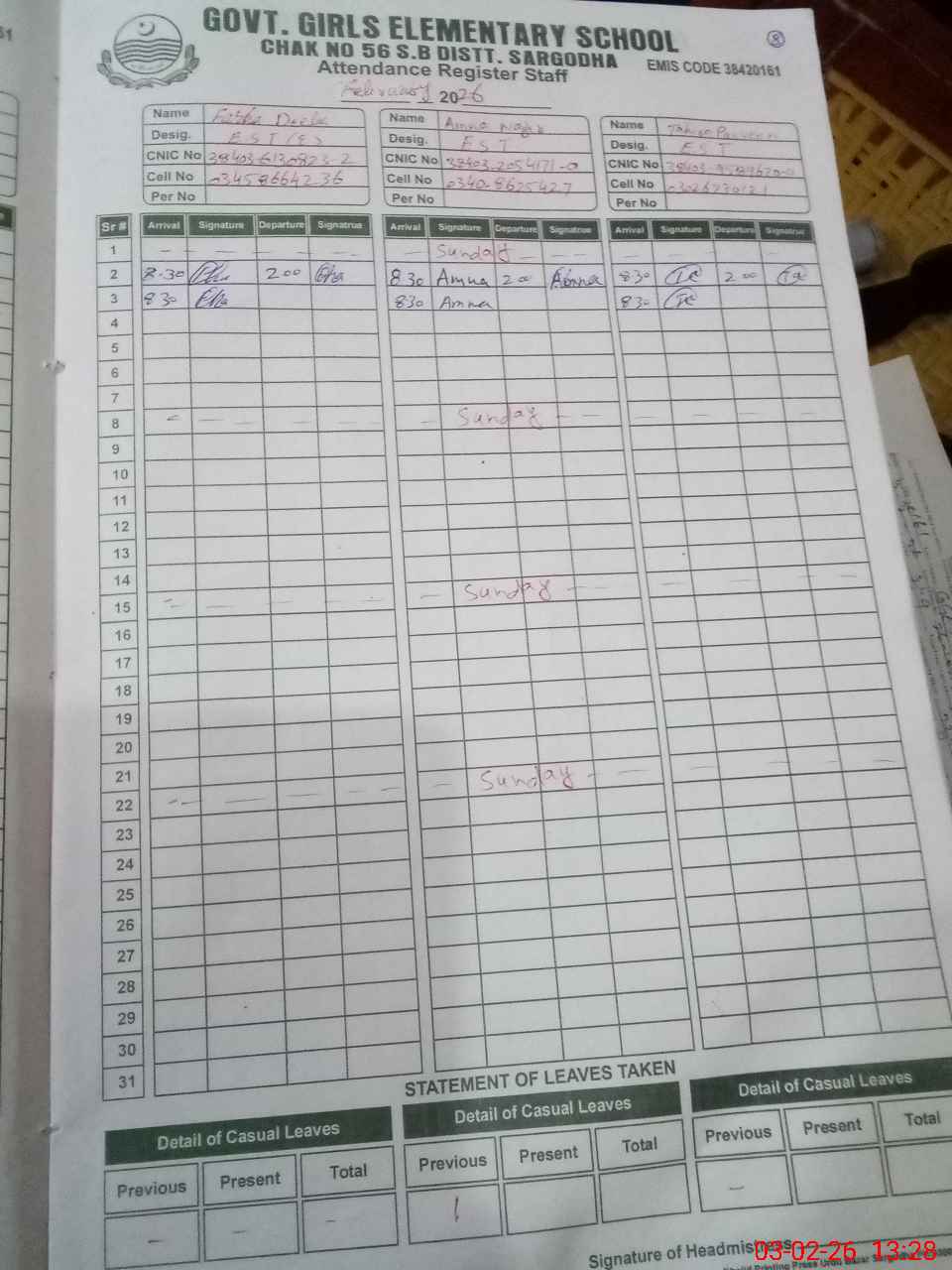 | CNIC | Full Name | Designation | R/C | Absence During Last Calender Month |