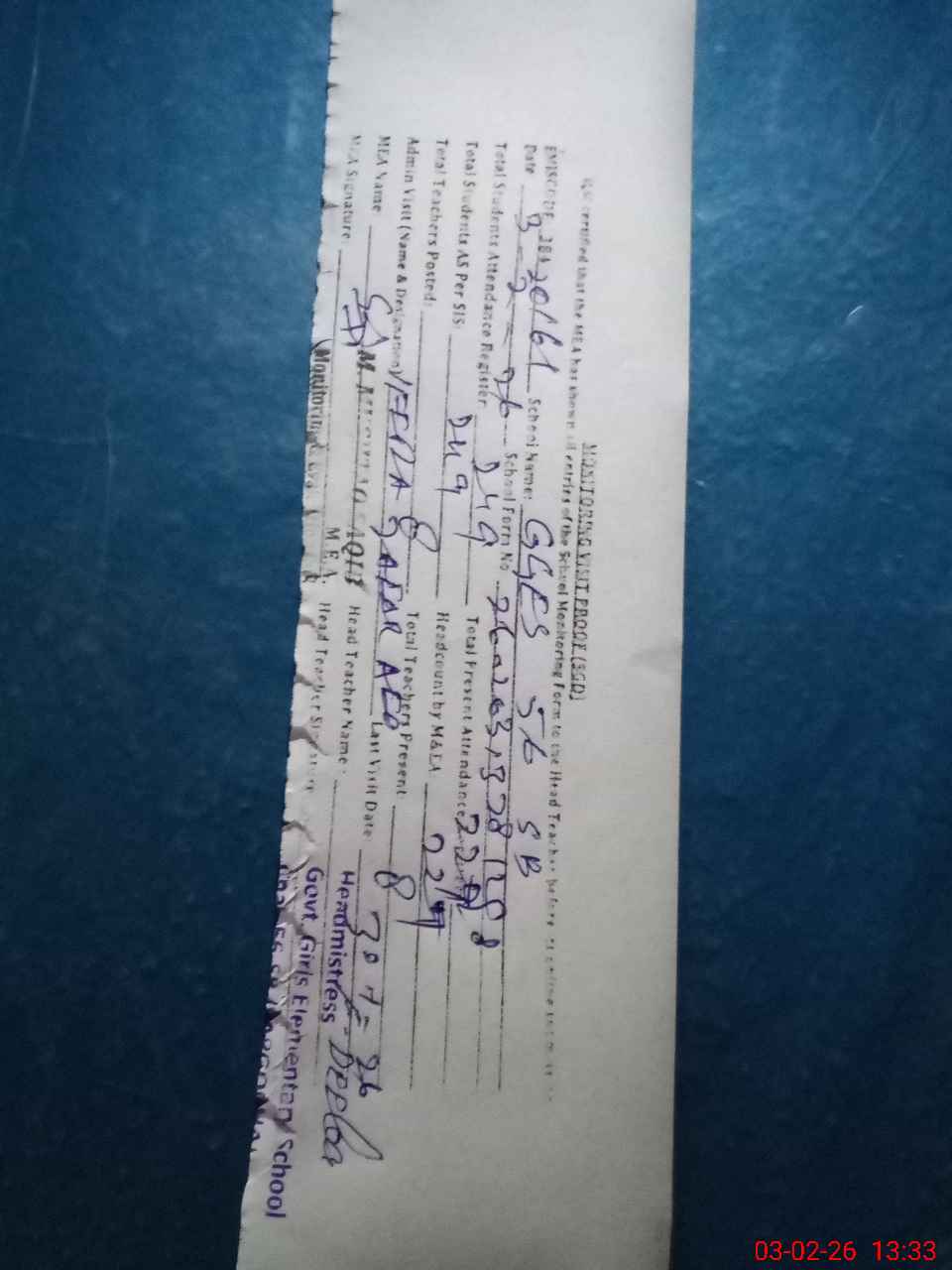 | Attendance Register | Head Teacher | MEA with School | Visit Proof |