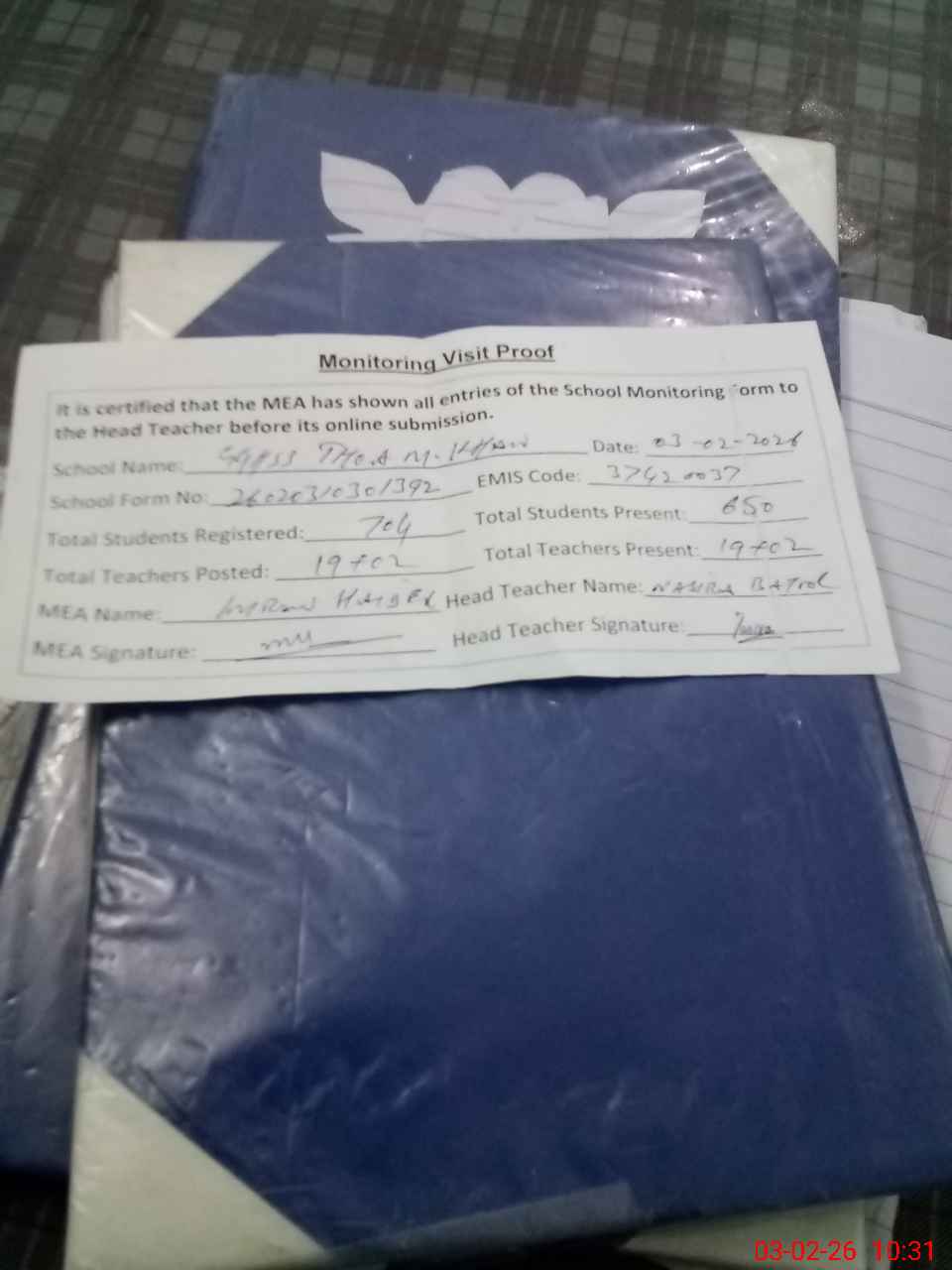 | Attendance Register | Head Teacher | MEA with School | Visit Proof |