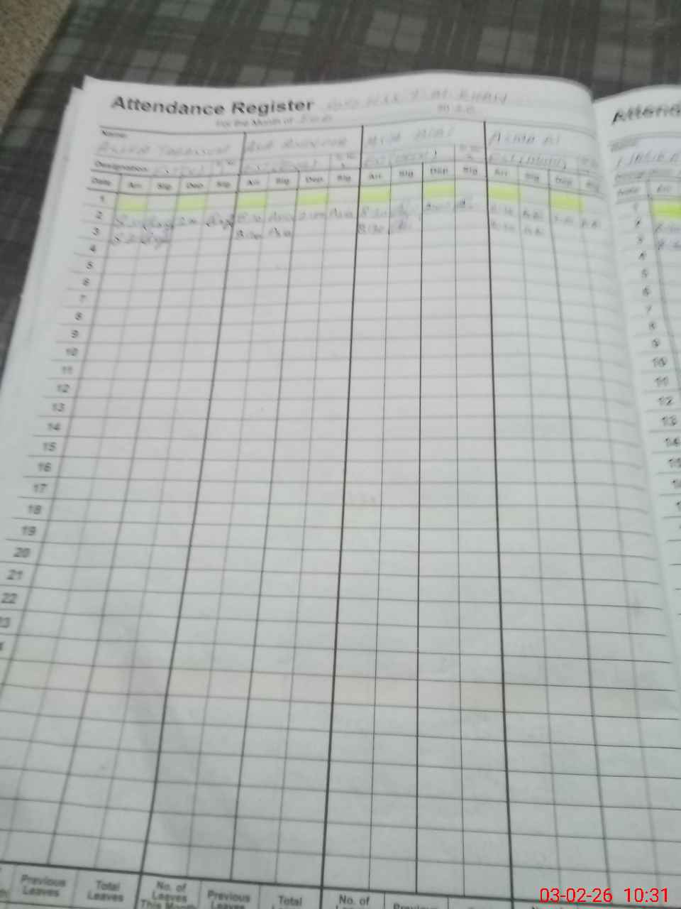 | CNIC | Full Name | Designation | R/C | Absence During Last Calender Month |