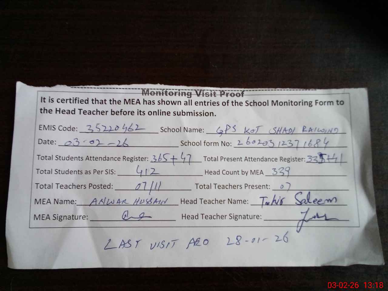 | EMIS Code: 35220462 | Name of School: GPS KOT SHADI RAIWIND | |||