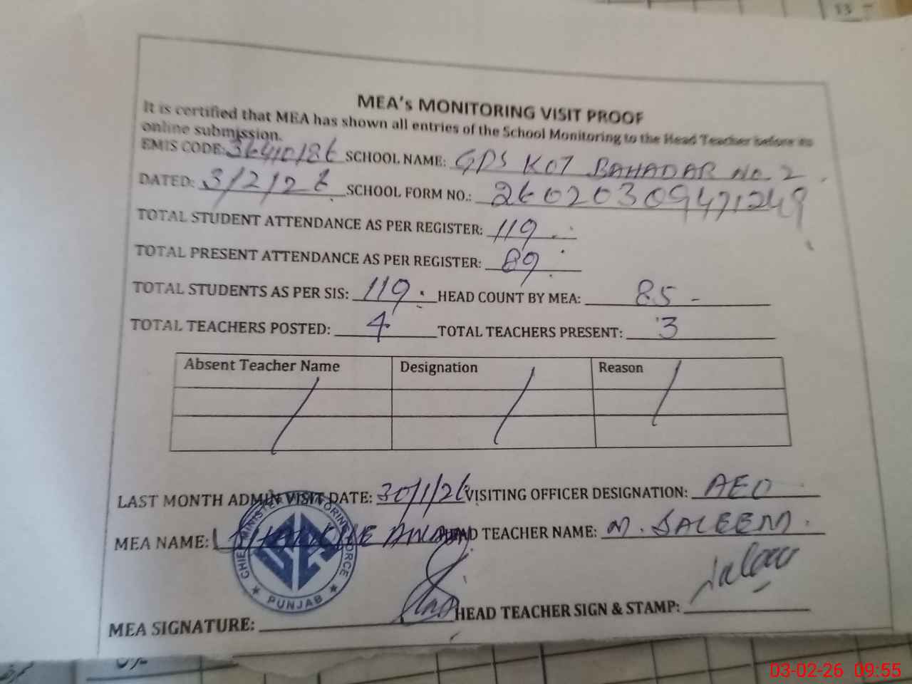 | EMIS Code: 36410186 | Name of School: GPS KOT BAHADUR NO.2 P/O MUBARAK PUR, KABIRWALA | |||