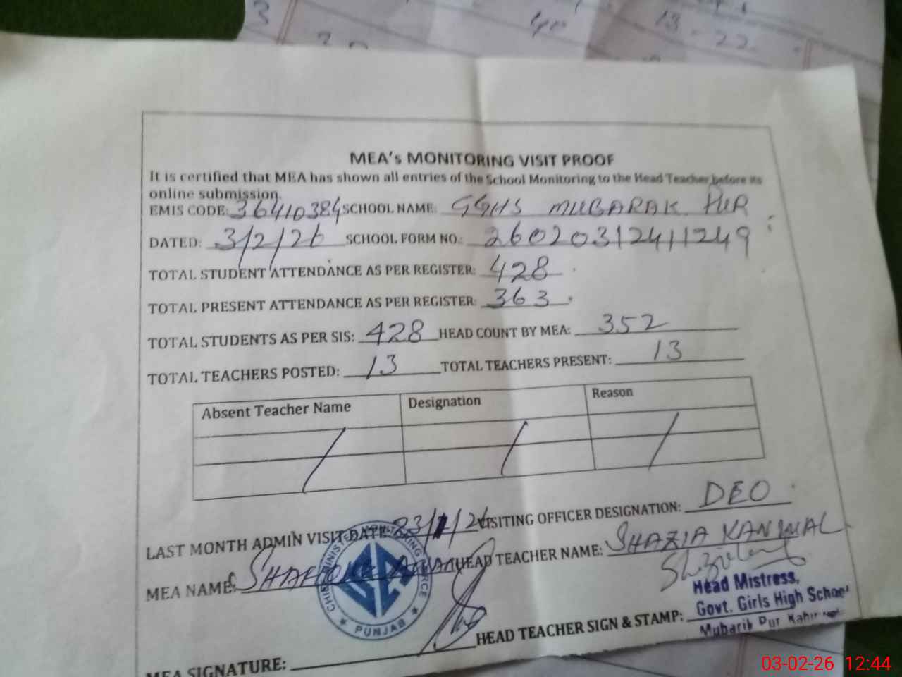 | Attendance Register | Head Teacher | MEA with School | Visit Proof |