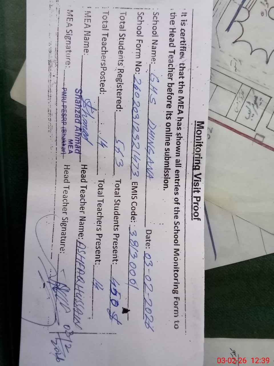 | Attendance Register | Head Teacher | MEA with School | Visit Proof |