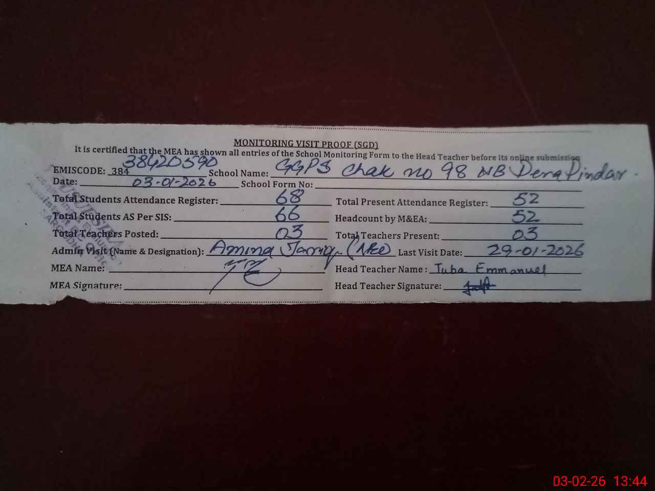 | EMIS Code: 38420590 | Name of School: GGPS CHAK NO.98 NB DERA DINDAR | |||