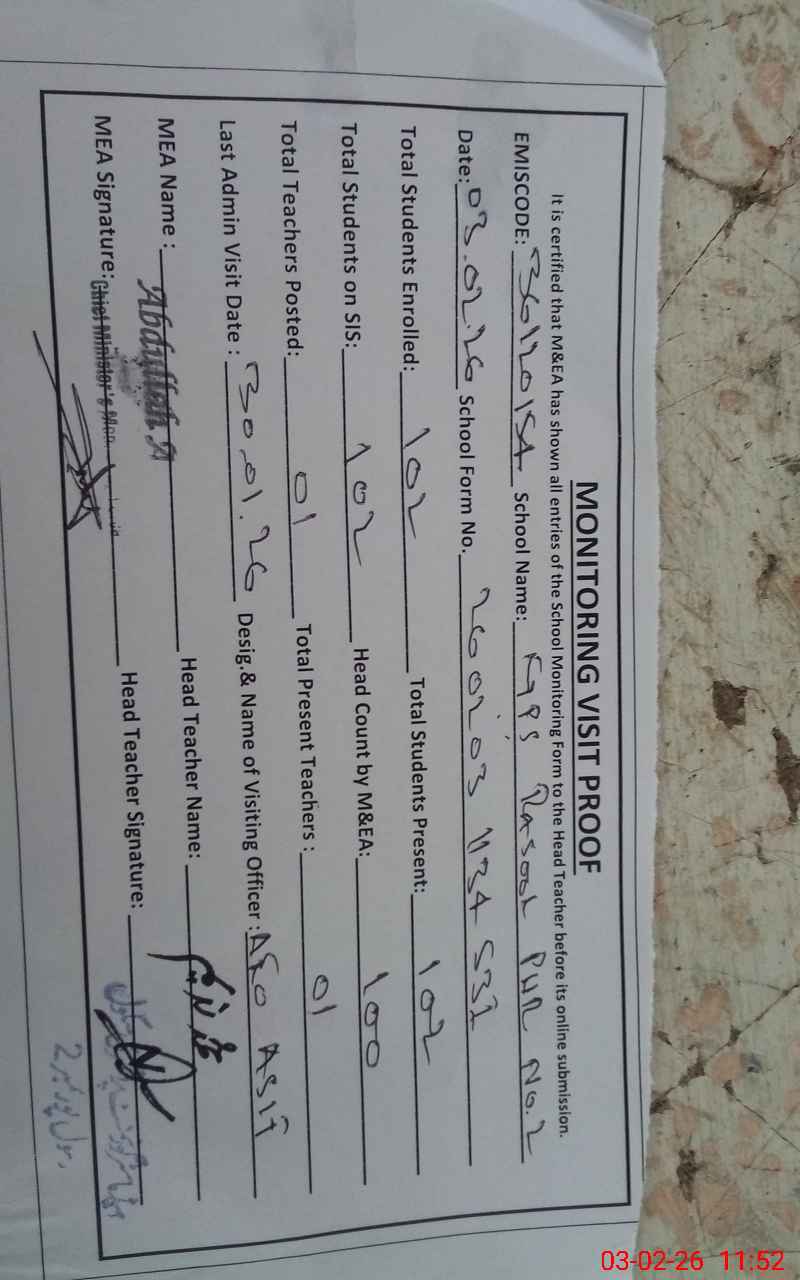 | EMIS Code: 36120154 | Name of School: GPS RASOOL PUR NO. 2 SHUJA ABAD | |||