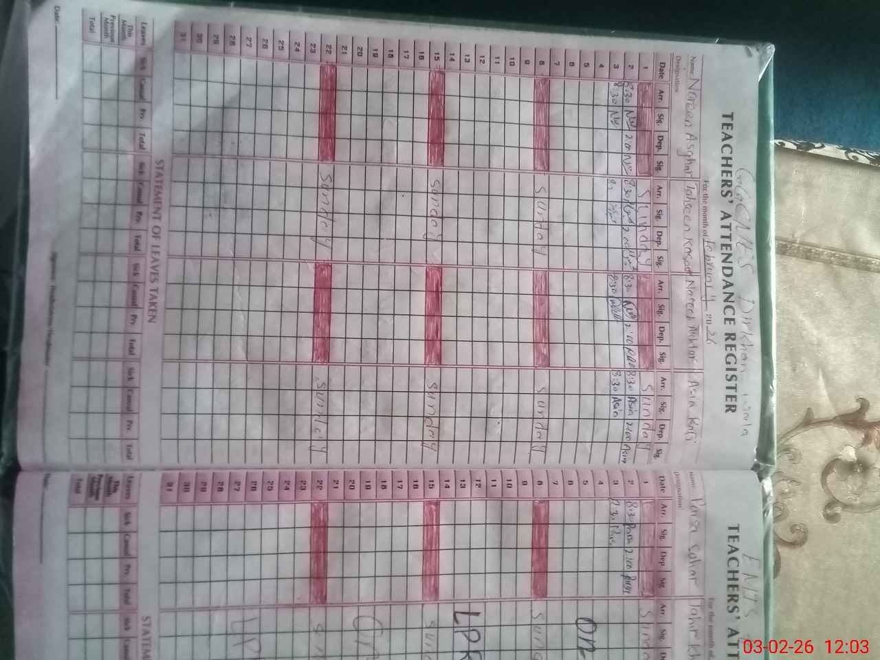 | CNIC | Full Name | Designation | R/C | Absence During Last Calender Month |
