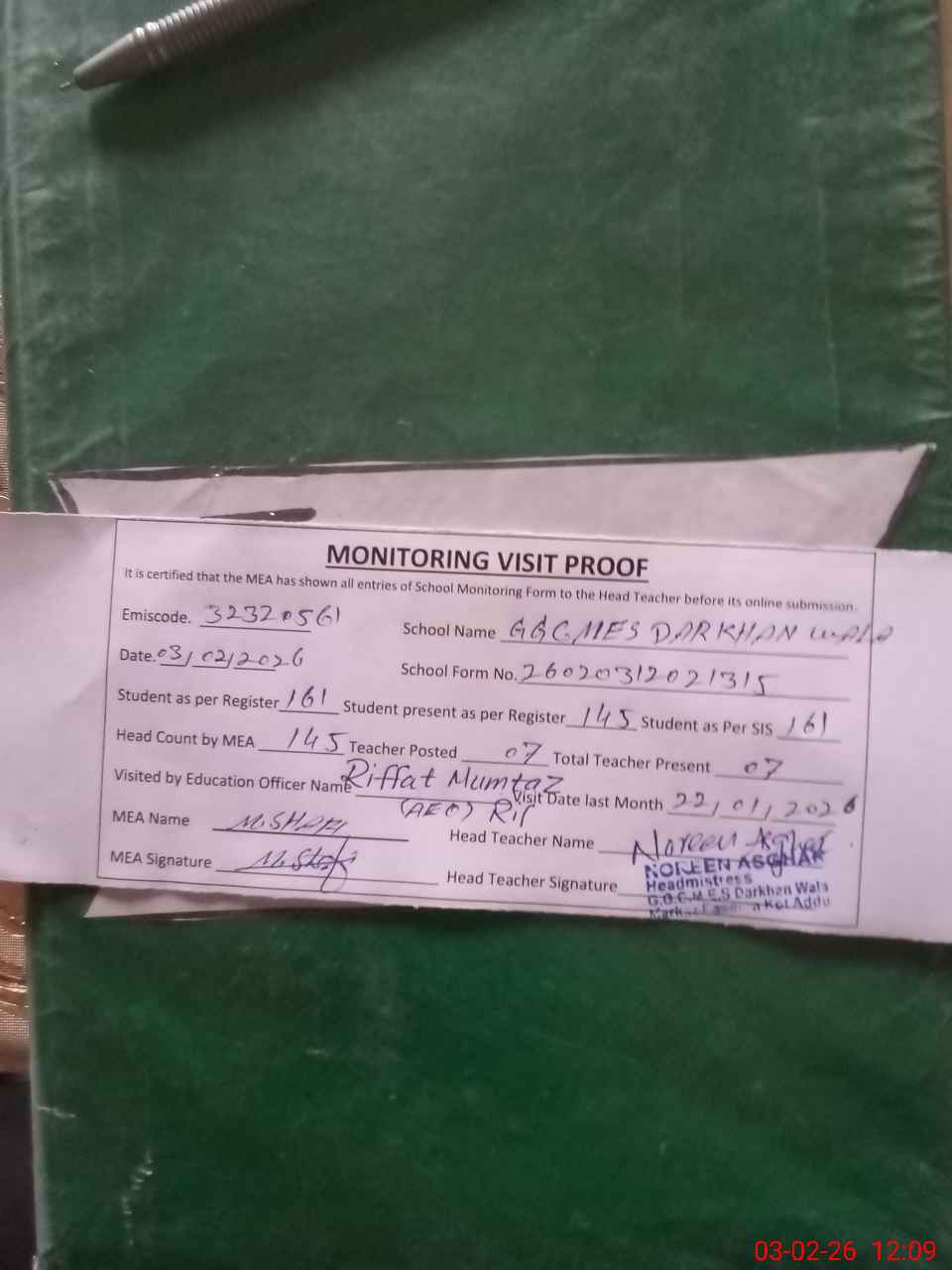 | Attendance Register | Head Teacher | MEA with School | Visit Proof |