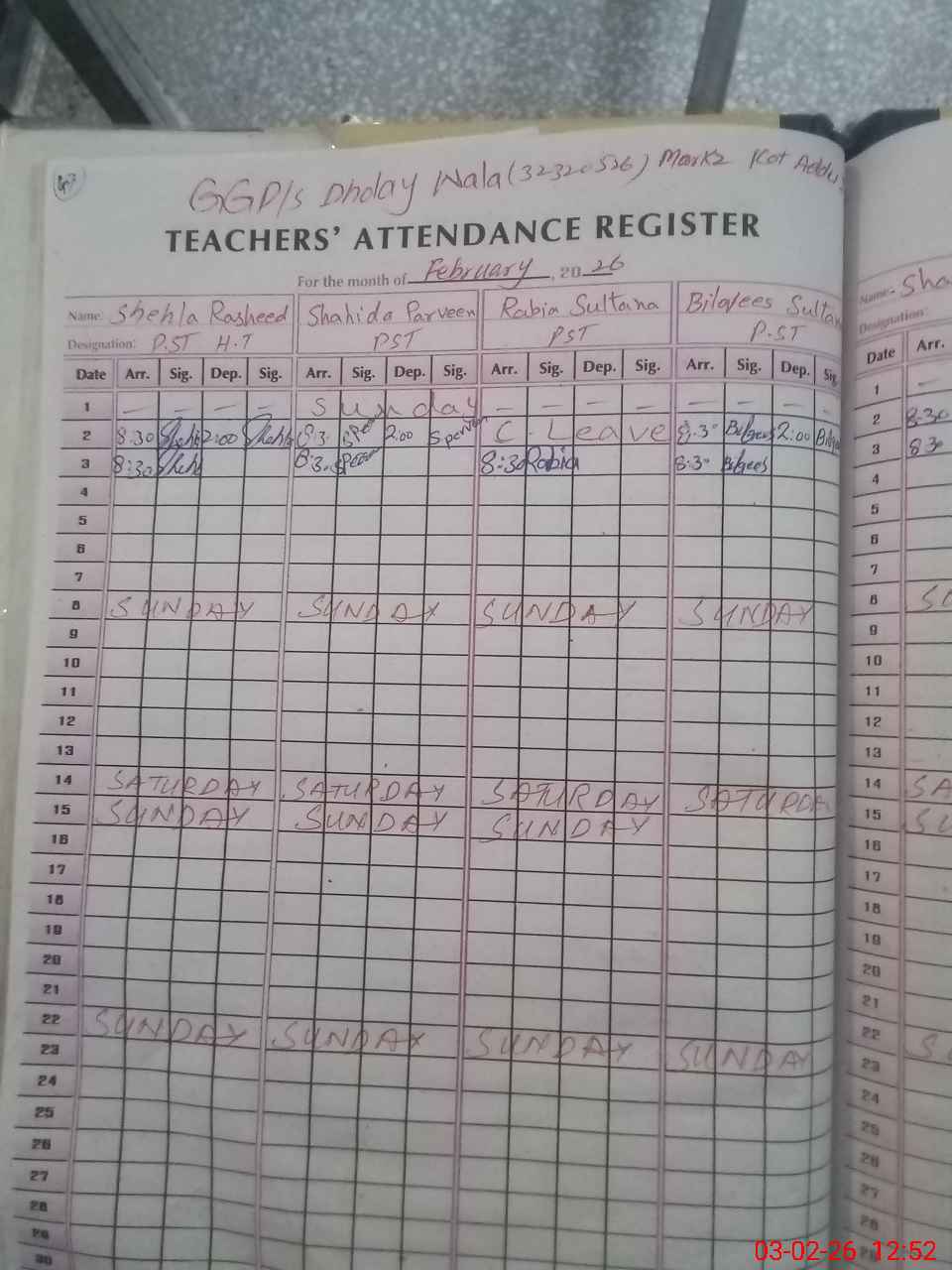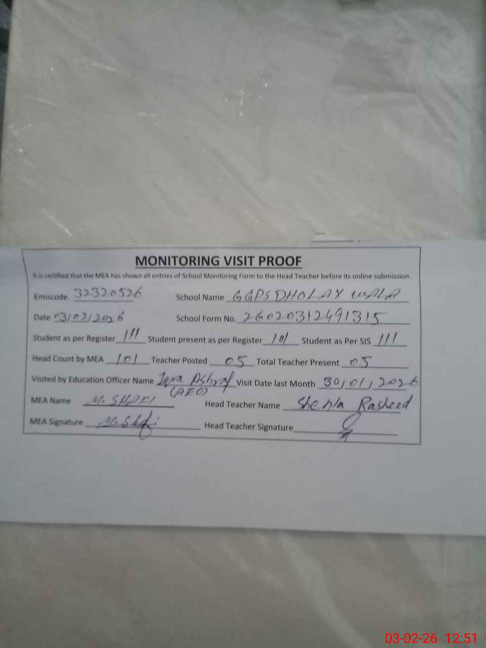 | EMIS Code: 32320526 | Name of School: GGPS DHOLAY WALA | |||