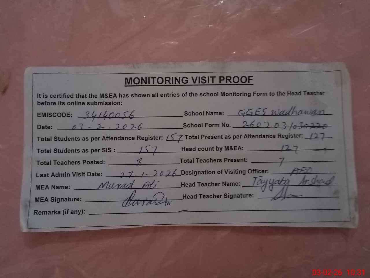 | Attendance Register | Head Teacher | MEA with School | Visit Proof |