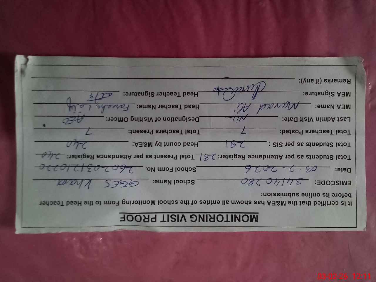 | Certified that this School was Inspected by the Undersigned MEA/DMO Today and the Information Stated Above is as Per Record. | |||||