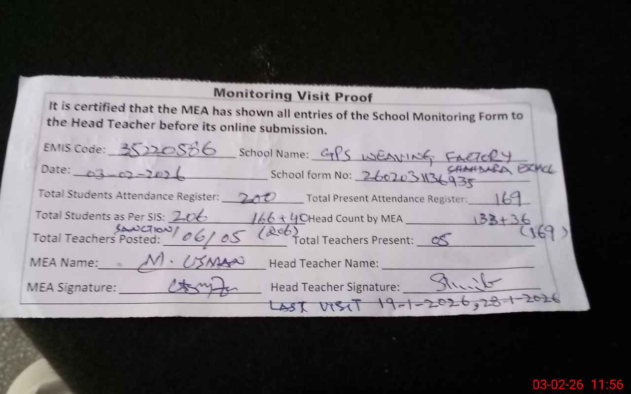 | EMIS Code: 35220586 | Name of School: GPS WEAVING FACTORY SHAHDARA (EX-MCL) | |||