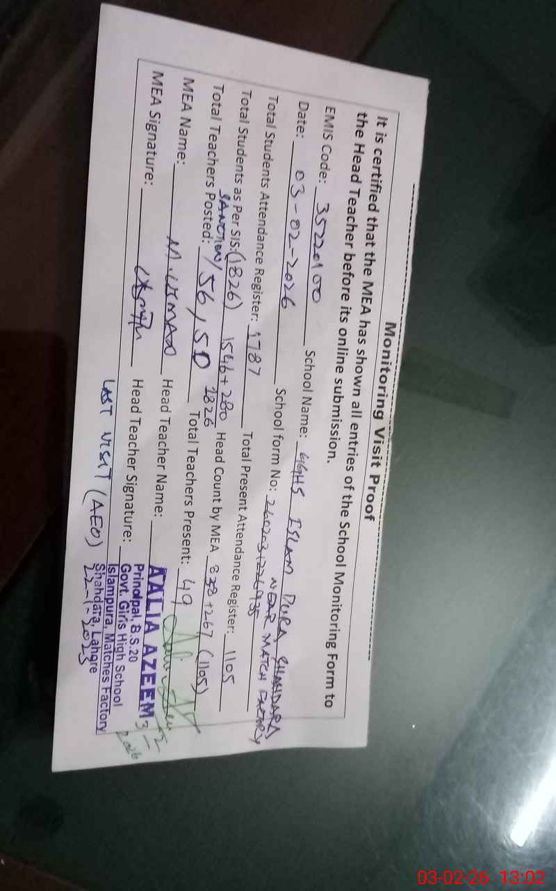 | Attendance Register | Head Teacher | MEA with School | Visit Proof |