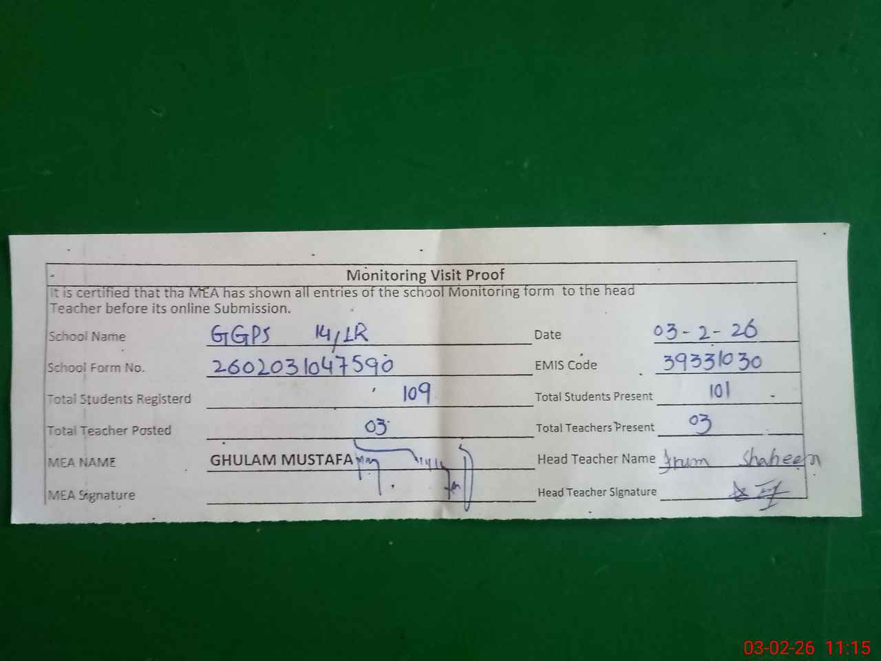 | Attendance Register | Head Teacher | MEA with School | Visit Proof |