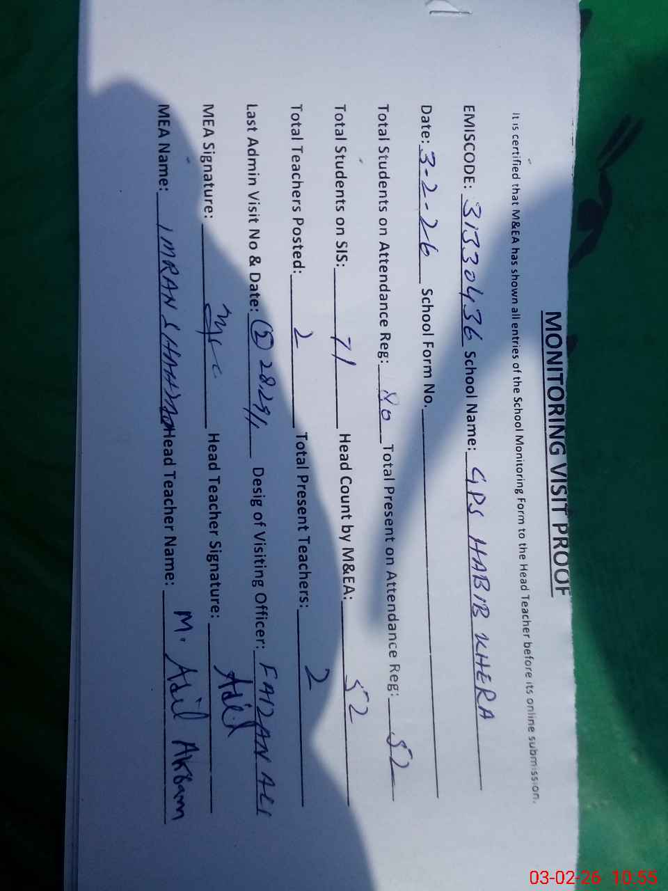 | EMIS Code: 31330436 | Name of School: GPS HABIB KHERA | |||