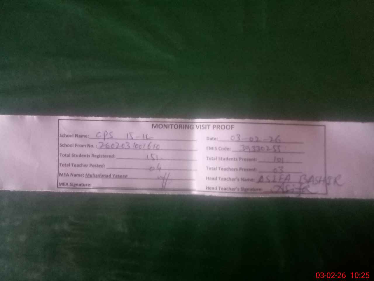 | Monitoring Date: 03-02-2026 | Start Time: 03-02-2026 10:01 AM | End Time: 03-02-2026 10:27 AM | Name of MEA: MU**** YA**** | |