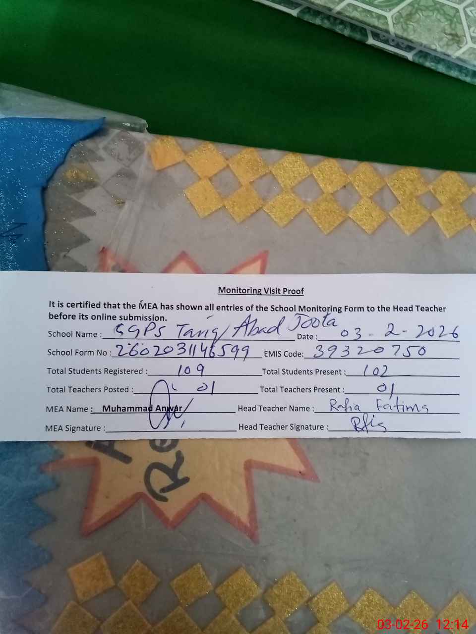 | Attendance Register | Head Teacher | MEA with School | Visit Proof |