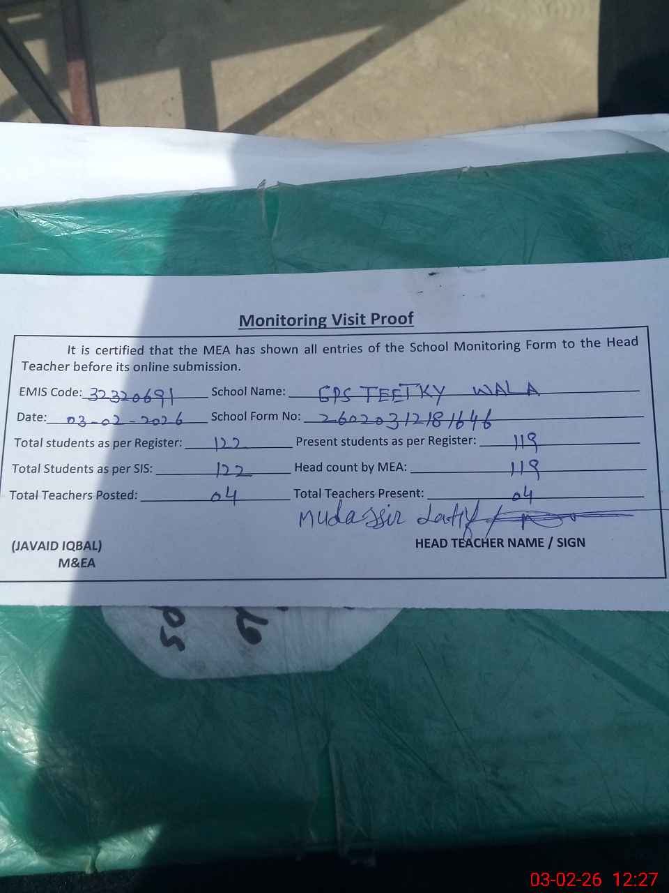 | Attendance Register | Head Teacher | MEA with School | Visit Proof |
