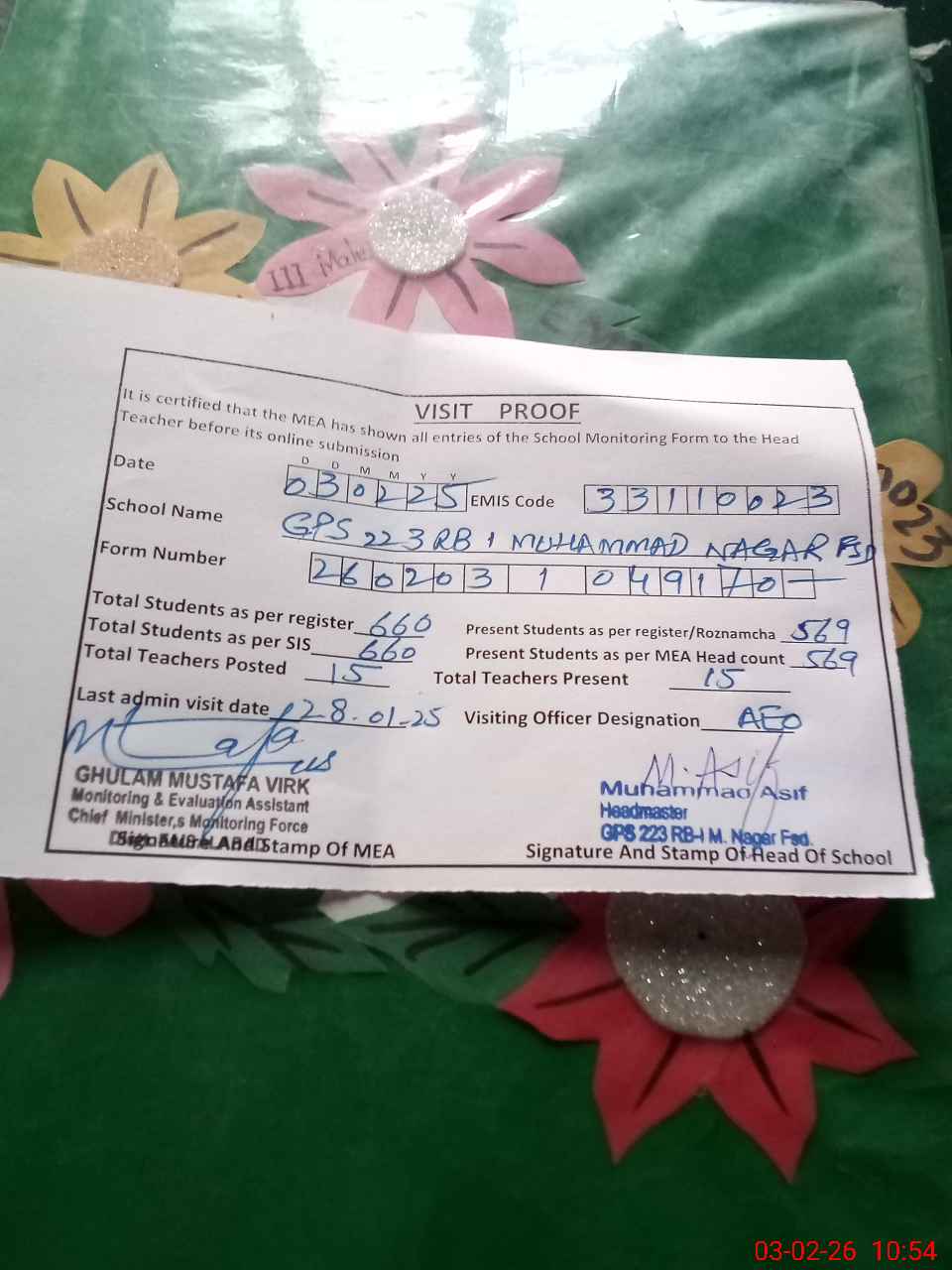 | Attendance Register | Head Teacher | MEA with School | Visit Proof |