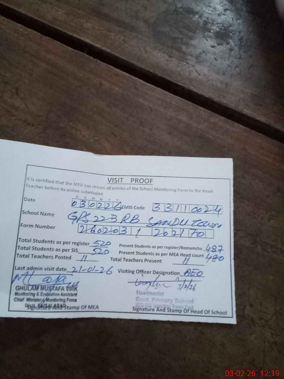 | EMIS Code: 33110024 | Name of School: GPS 223 RB SANDU TOWN FSD | |||