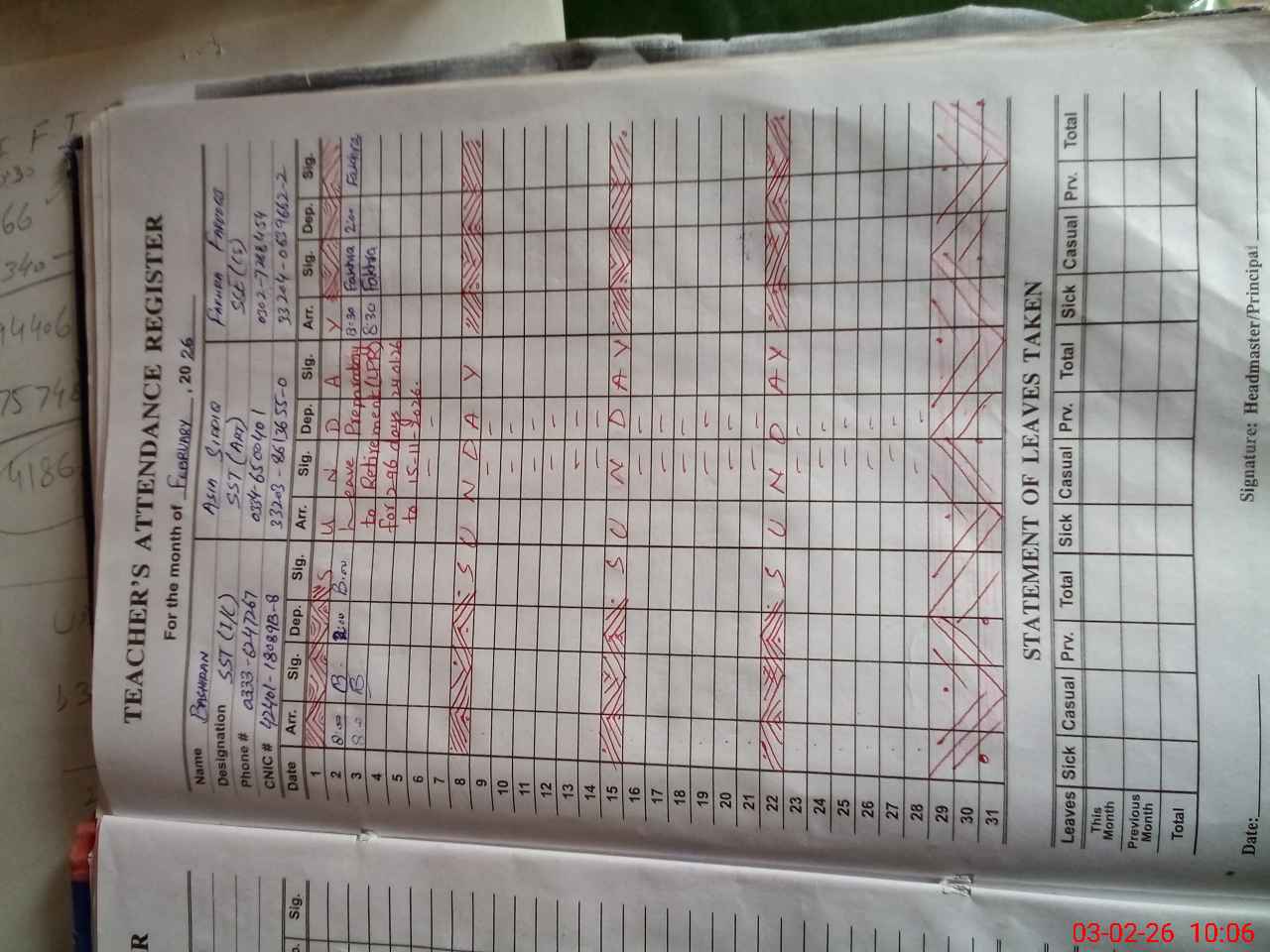 | CNIC | Full Name | Designation | R/C | Absence During Last Calender Month |