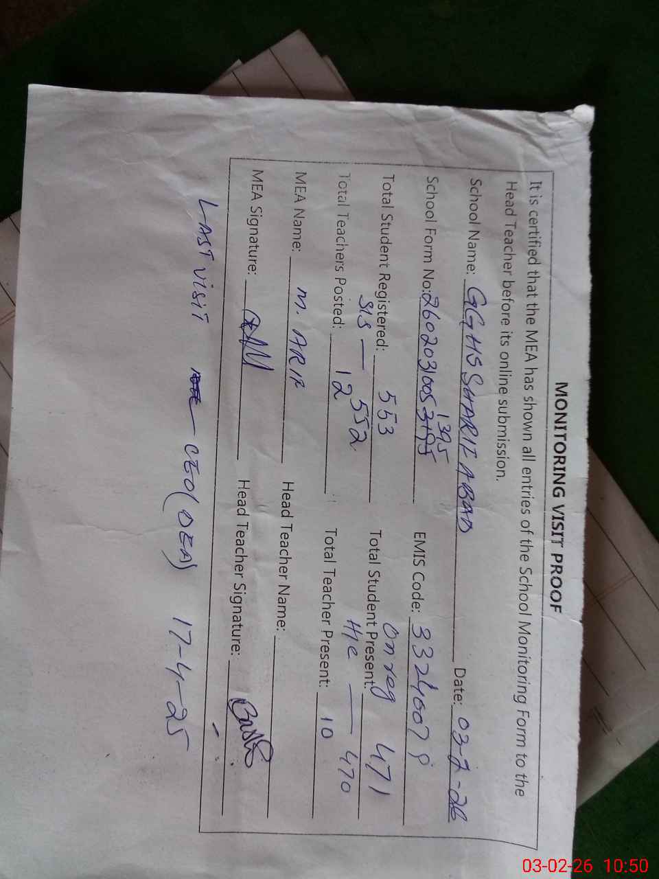 | Attendance Register | Head Teacher | MEA with School | Visit Proof |
