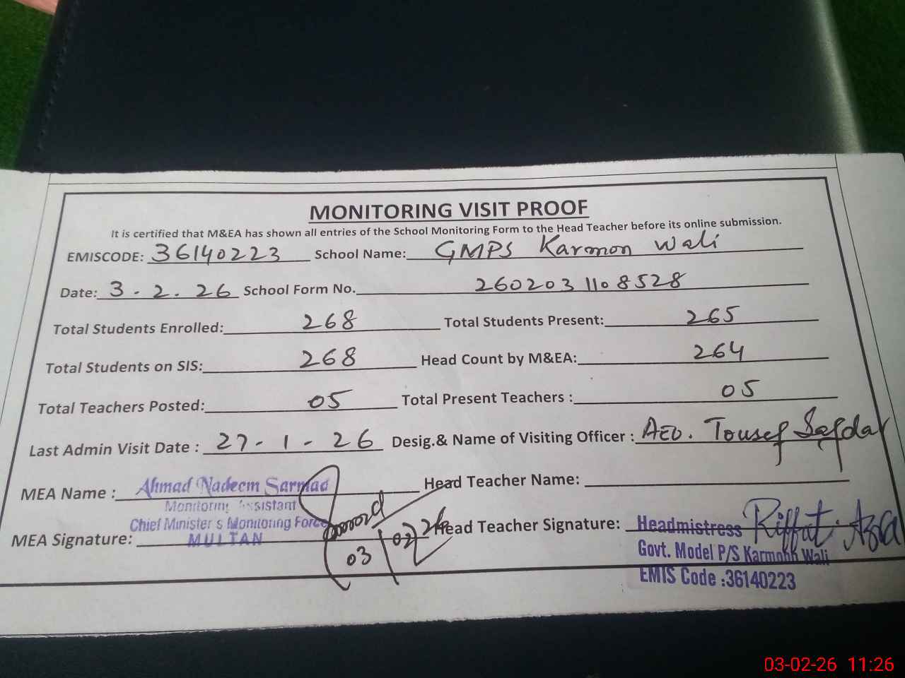 | Attendance Register | Head Teacher | MEA with School | Visit Proof |