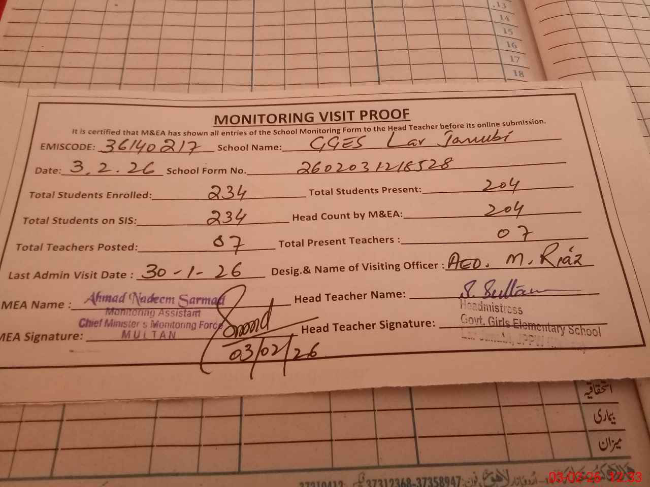 | Certified that this School was Inspected by the Undersigned MEA/DMO Today and the Information Stated Above is as Per Record. | |||||