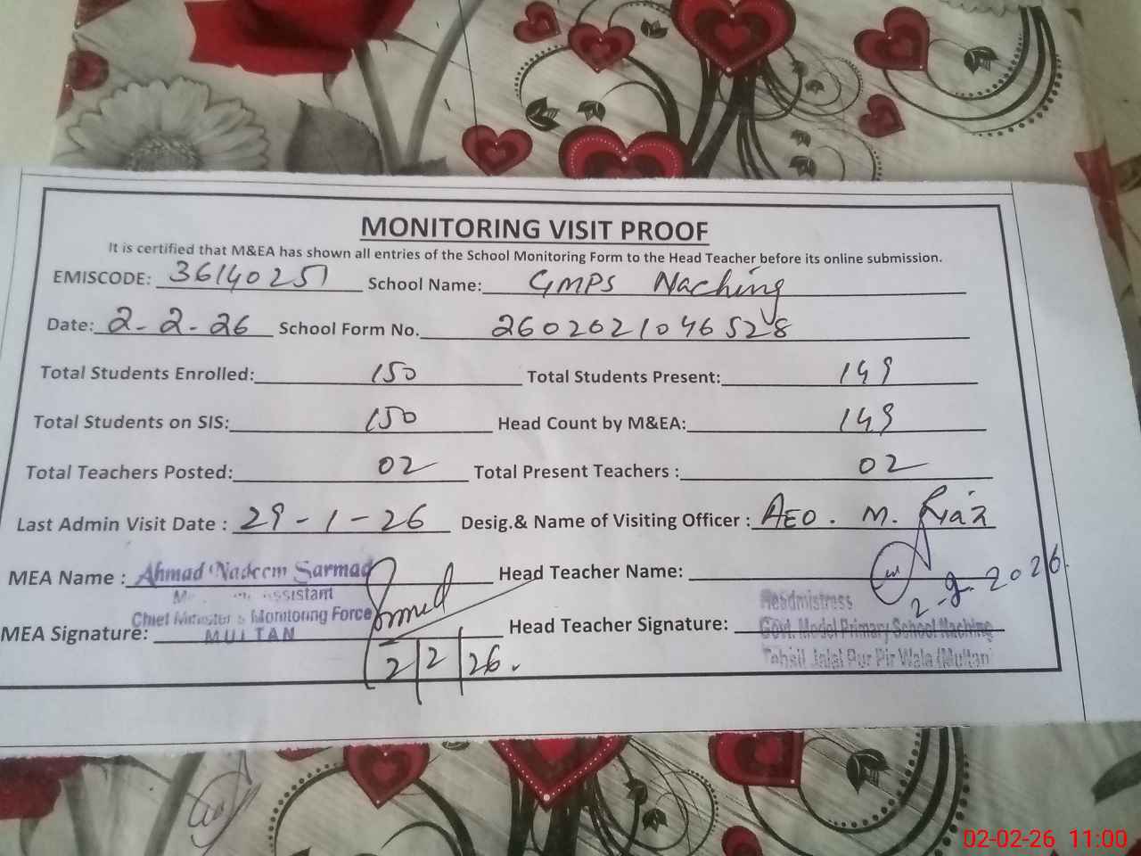 | Attendance Register | Head Teacher | MEA with School | Visit Proof |