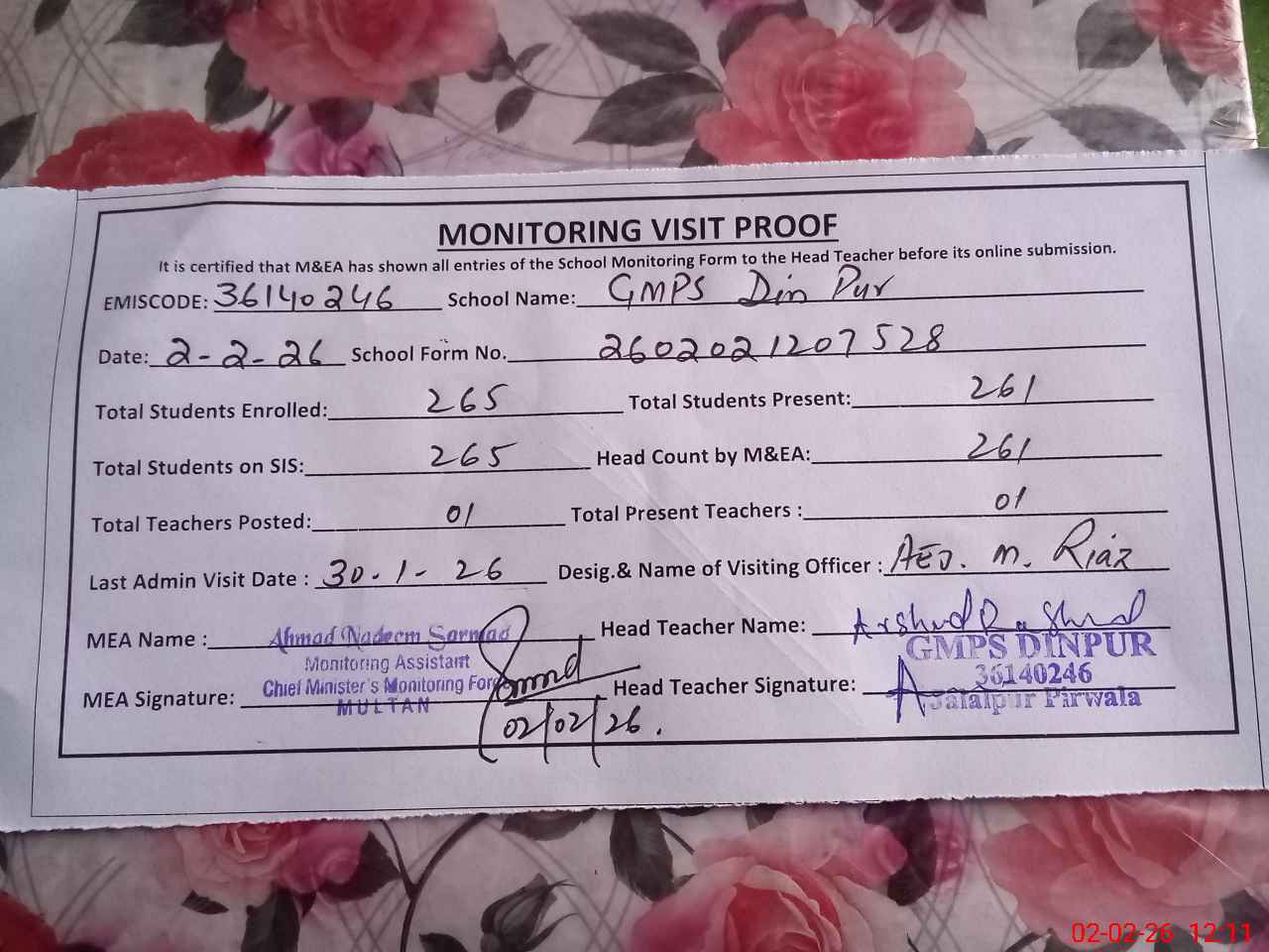 | Attendance Register | Head Teacher | MEA with School | Visit Proof |