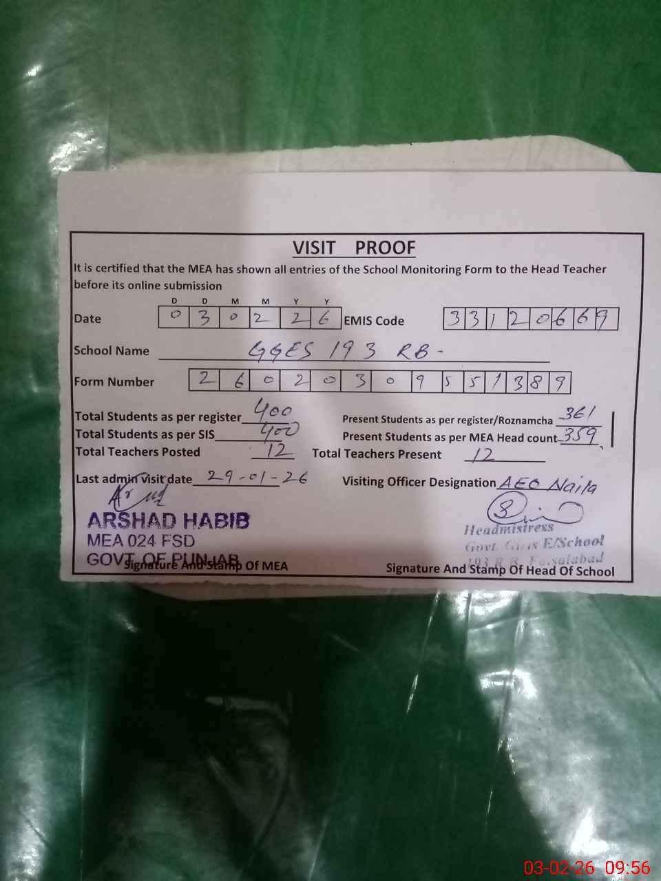 | Attendance Register | Head Teacher | MEA with School | Visit Proof |