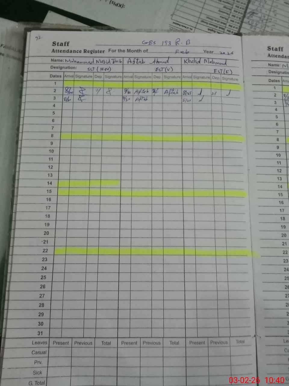 | CNIC | Full Name | Designation | R/C | Absence During Last Calender Month |