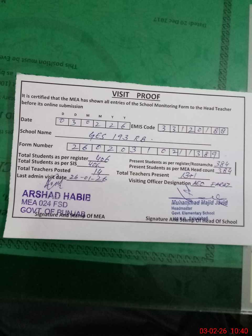 | Certified that this School was Inspected by the Undersigned MEA/DMO Today and the Information Stated Above is as Per Record. | |||||