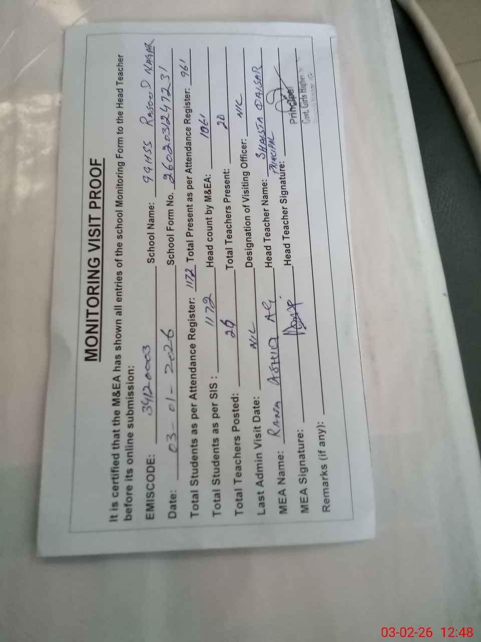 | Attendance Register | Head Teacher | MEA with School | Visit Proof |