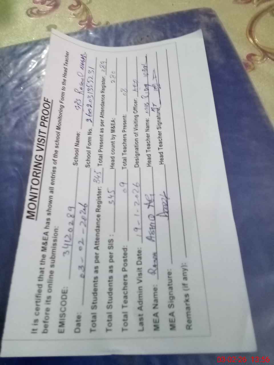 | Attendance Register | Head Teacher | MEA with School | Visit Proof |