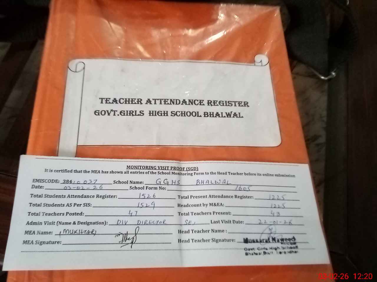 | EMIS Code: 38410037 | Name of School: GGHS BHALWAL | |||