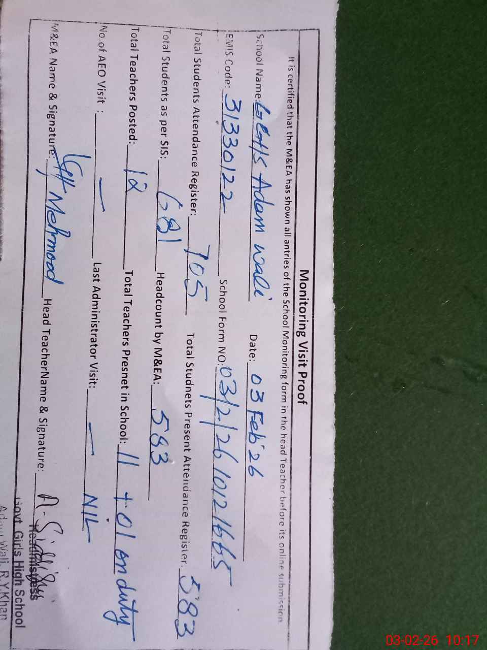 | Attendance Register | Head Teacher | MEA with School | Visit Proof |