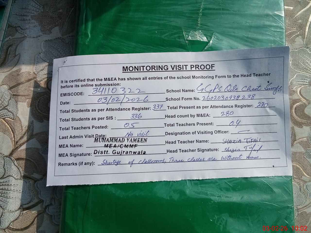 | EMIS Code: 34110322 | Name of School: GGPS QILA CHEET SINGH | |||