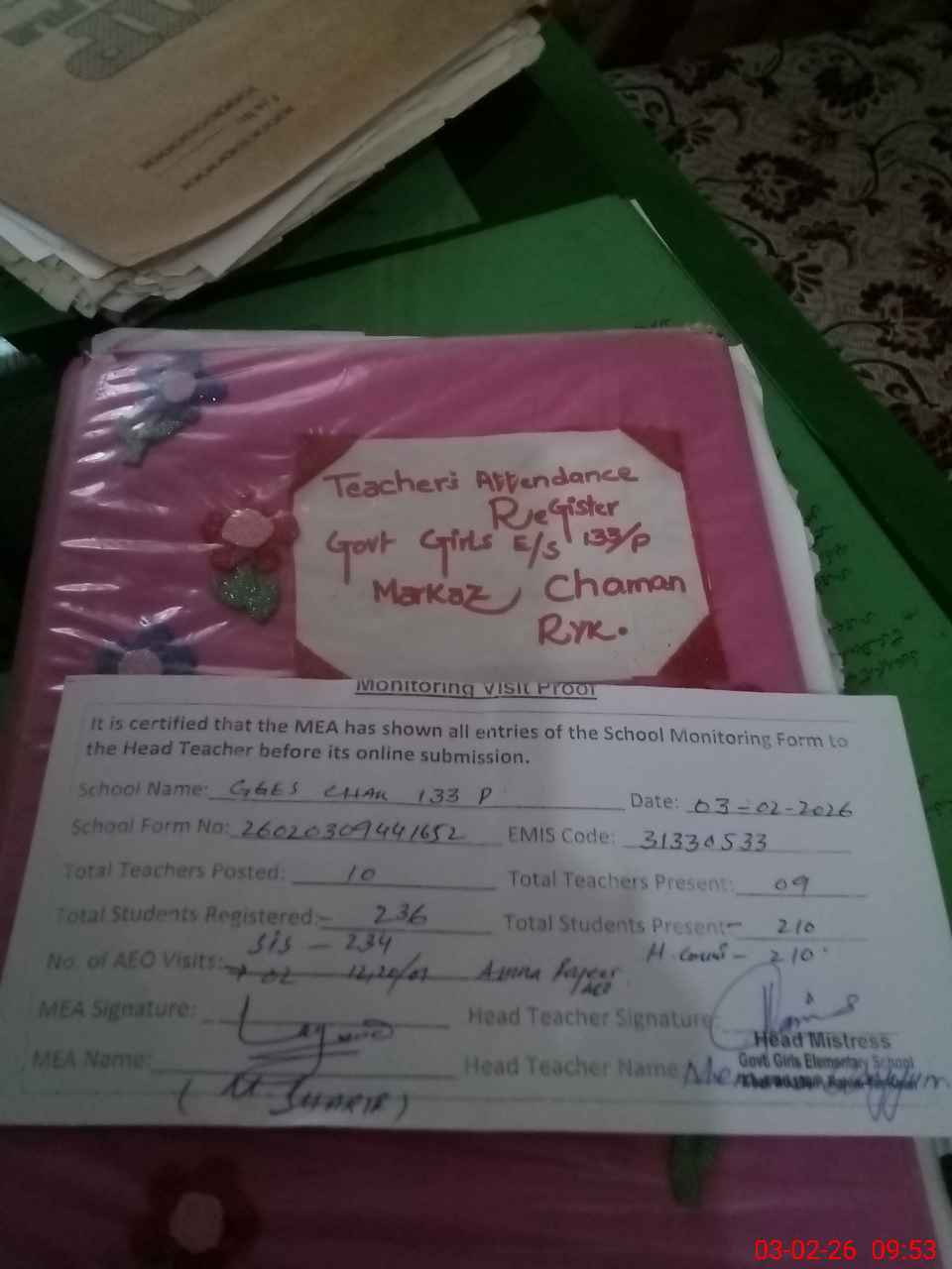 | District: RAHIMYAR KHAN | Tehsil: RAHIMYAR KHAN | Markaz: CHAMAN-FEMALE | Level: Middle | |