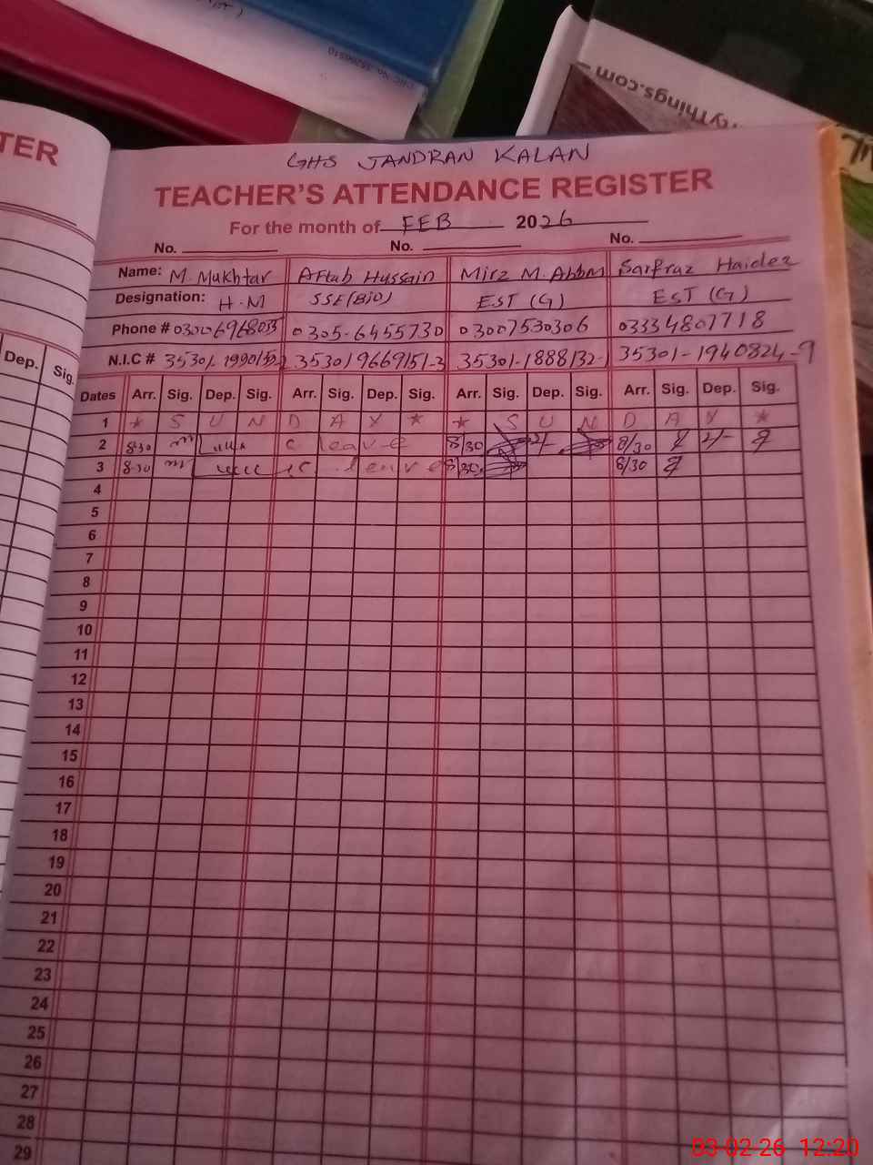 | CNIC | Full Name | Designation | R/C | Absence During Last Calender Month |