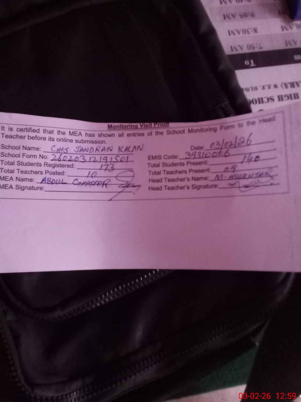 | Attendance Register | Head Teacher | MEA with School | Visit Proof |