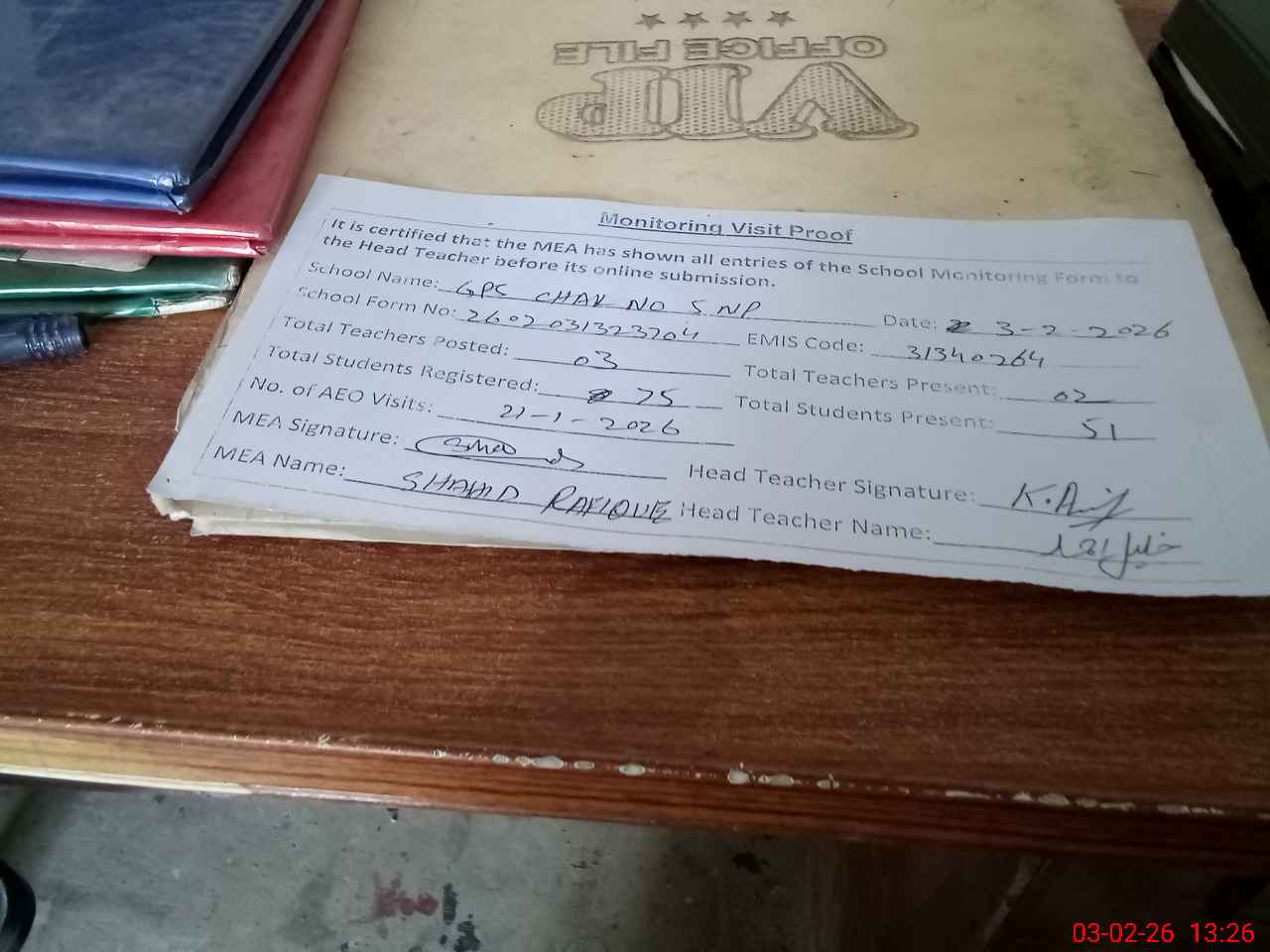 | Attendance Register | Head Teacher | MEA with School | Visit Proof |