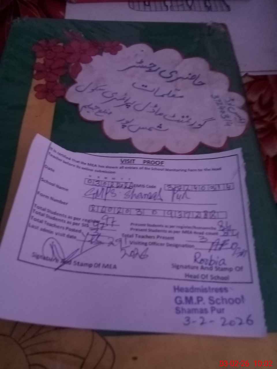 | Attendance Register | Head Teacher | MEA with School | Visit Proof |
