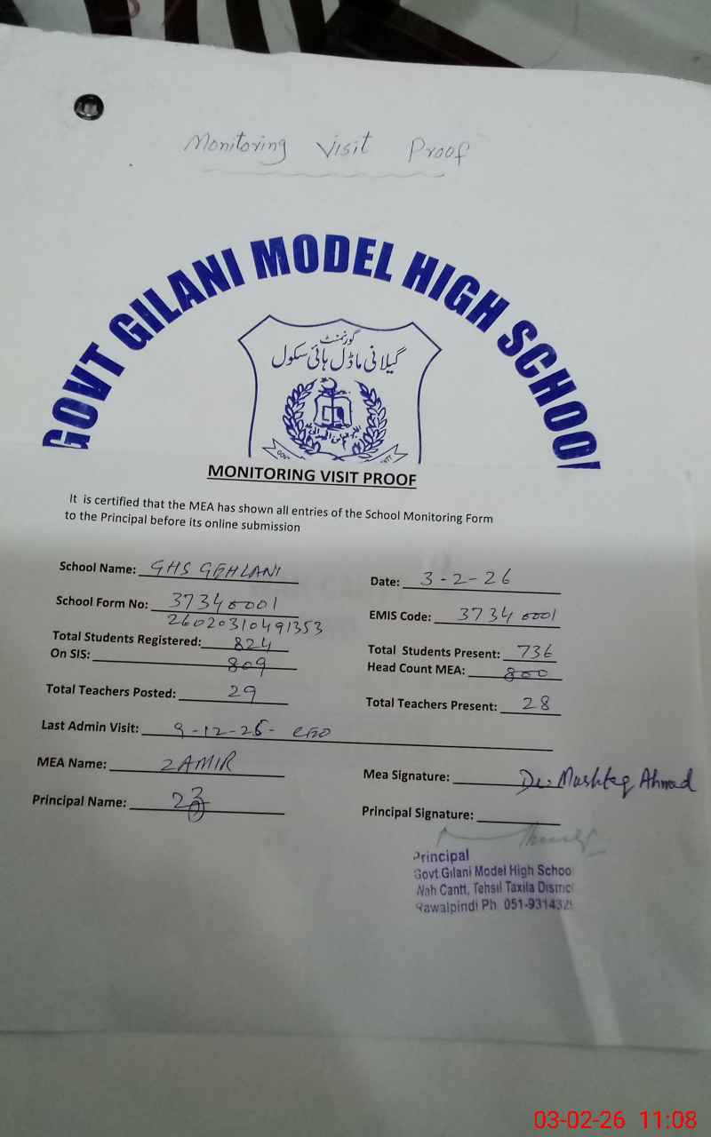 | EMIS Code: 37340001 | Name of School: GHS GELLANI MODEL WAH CANTT | |||