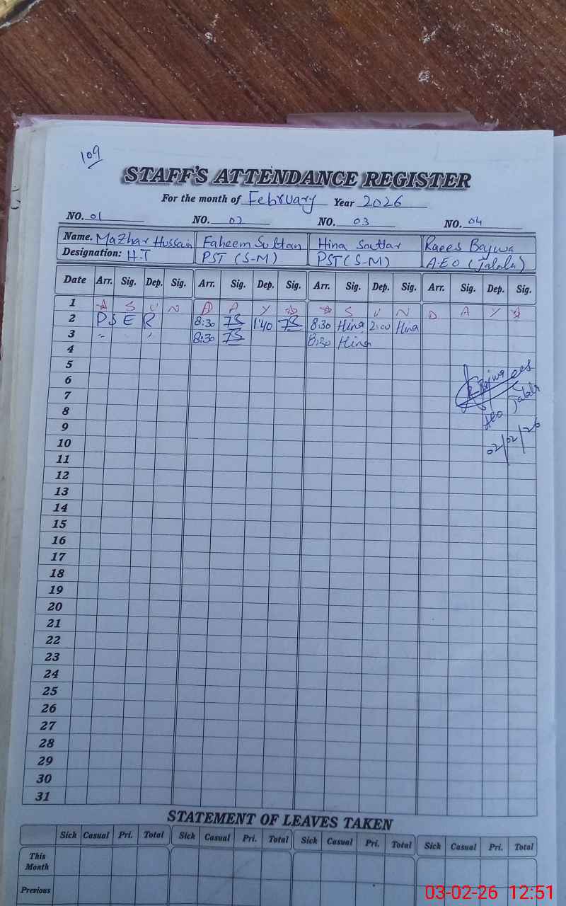 | CNIC | Full Name | Designation | R/C | Absence During Last Calender Month |