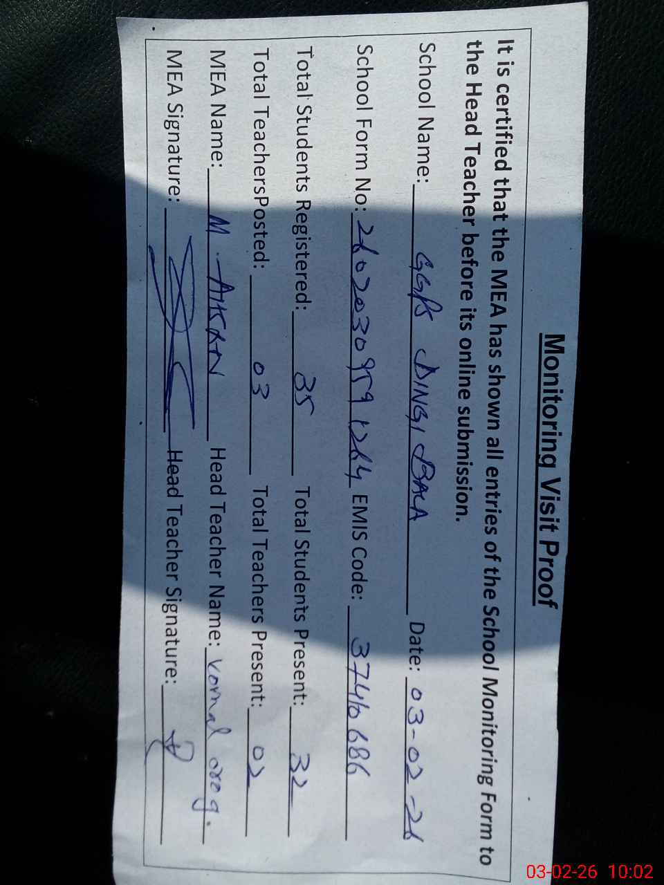 | Attendance Register | Head Teacher | MEA with School | Visit Proof |