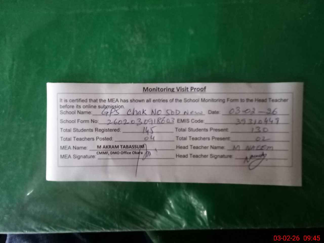 | Attendance Register | Head Teacher | MEA with School | Visit Proof |