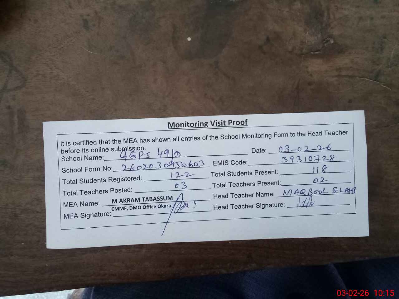 | Monitoring Date: 03-02-2026 | Start Time: 03-02-2026 09:50 AM | End Time: 03-02-2026 10:15 AM | Name of MEA: MU**** AK**** TA**** | |
